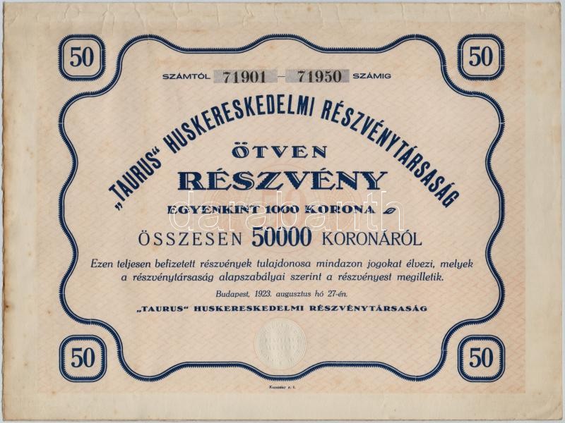 Leírás: Budapest 1923. "'Taurus Huskereskedelmi Részvénytársaság" ötven részvénye egyenként 1000K-ról, szárazpecséttel és szelvényekkel T:III- fo.