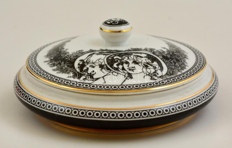 Leírás: Hollóházi Jurcsák László által tervezett porcelán bonbonier, matricás, hibátlan, jelzett, d: 14,5 cm