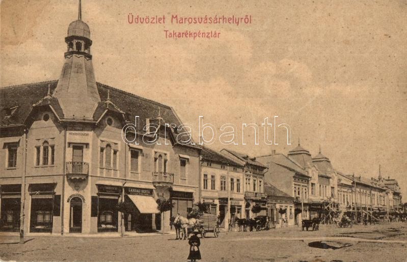 Marosvásárhely, Targu Mures; Takarékpénztár, Landau Berta, Tihanyi Lajos üzlete, Vendéglő és szálloda a Vadászkürthöz, étterem / savings bank, shops, restaurant and hotel (Rb)