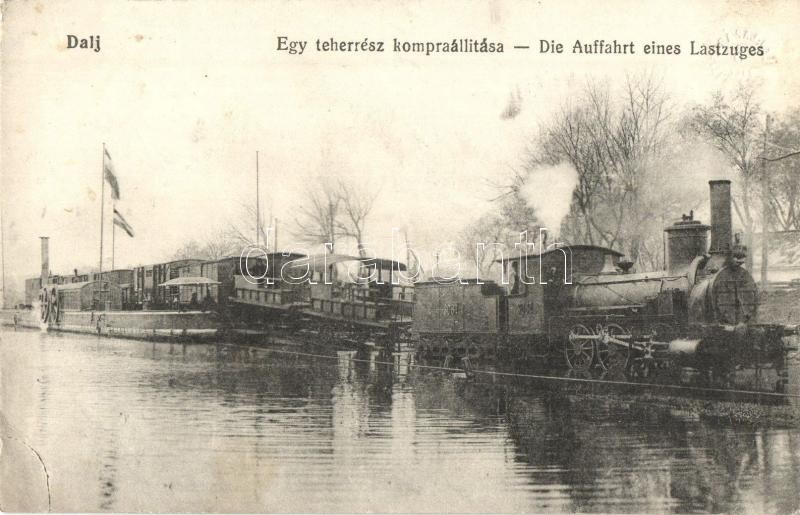 Dálya, Dalja, Dalj; Gőzkomp Gombos és Erdőd között a szabad Dunán. / Dampffähre zwischen Gombos-Erdőd auf der Donau, die Auffahrt eines Lastzuges / steam ferry with freight train between Bogojevo and Erdut on the Danube, locomotive (EK)