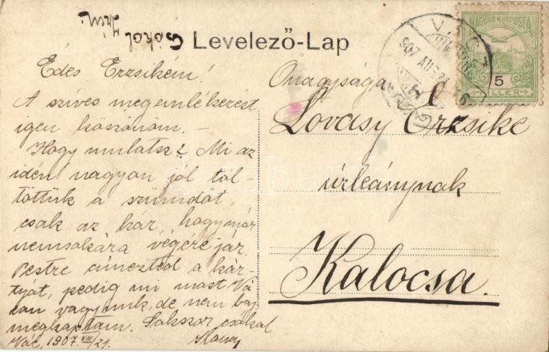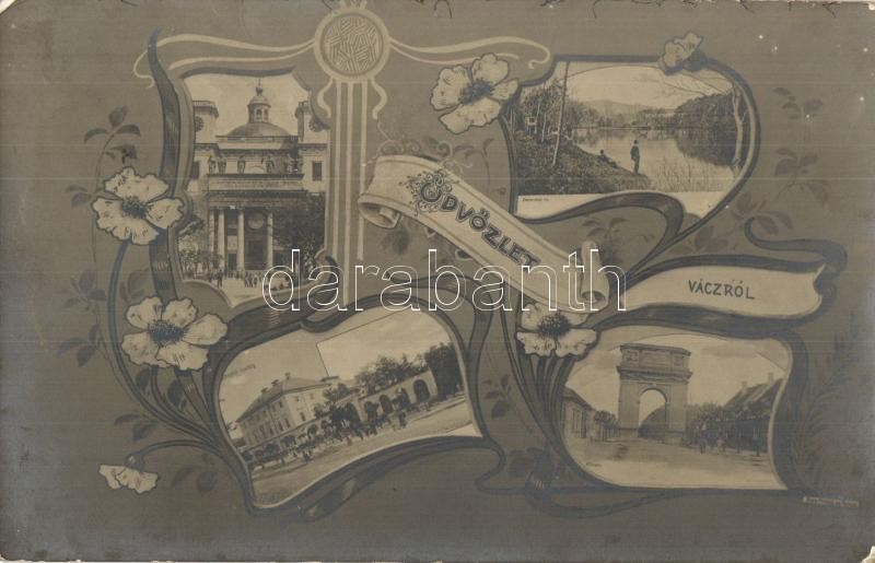 Leírás: 1907 Vác, Kőkapu, Püspöki kastély, Derecskei tó, Székesegyház. Kiadja Blau Miksa és Társa, Art Nouveau, floral (EK)