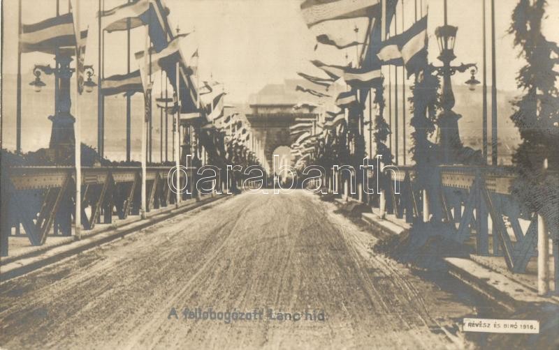 Leírás: 1916 Budapest, A fellobogózott Lánchíd Károly király koronázásnak alkalmából; Révész és Bíró felvétele