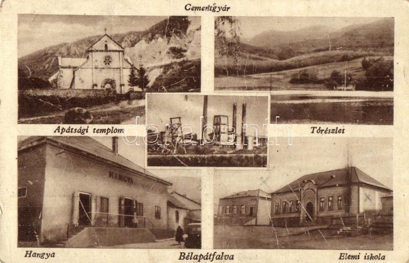 Leírás: Bélapátfalva, Cementgyár, tó, elemi iskola, apátsági templom, Hangya üzlete és saját kiadása (EB)