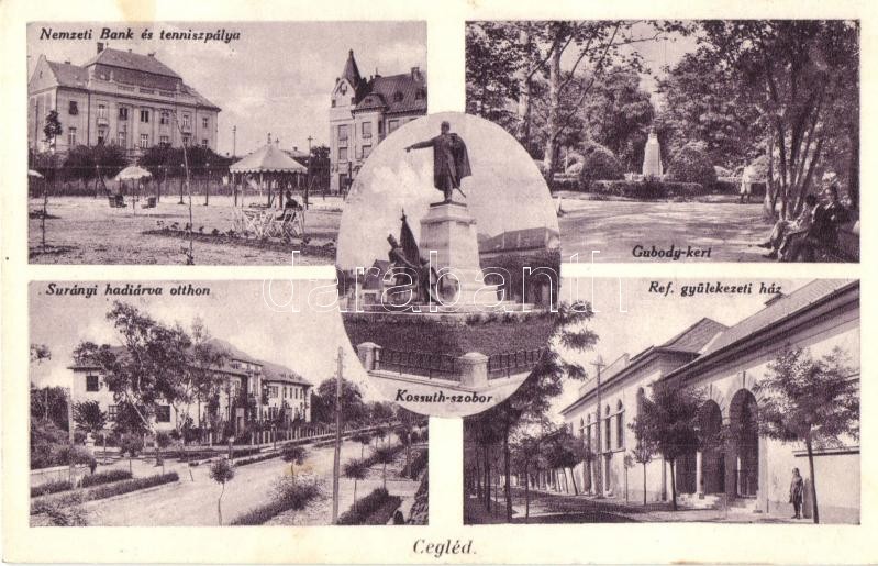 Leírás: Cegléd, Nemzeti Bank, teniszpálya, Gubody kert, Református gyülekezeti ház, Surányi hadiárva otthon, Kossuth szobor