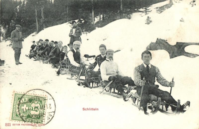 Leírás: Schlitteln / Winter sport, sledding people. TCV card