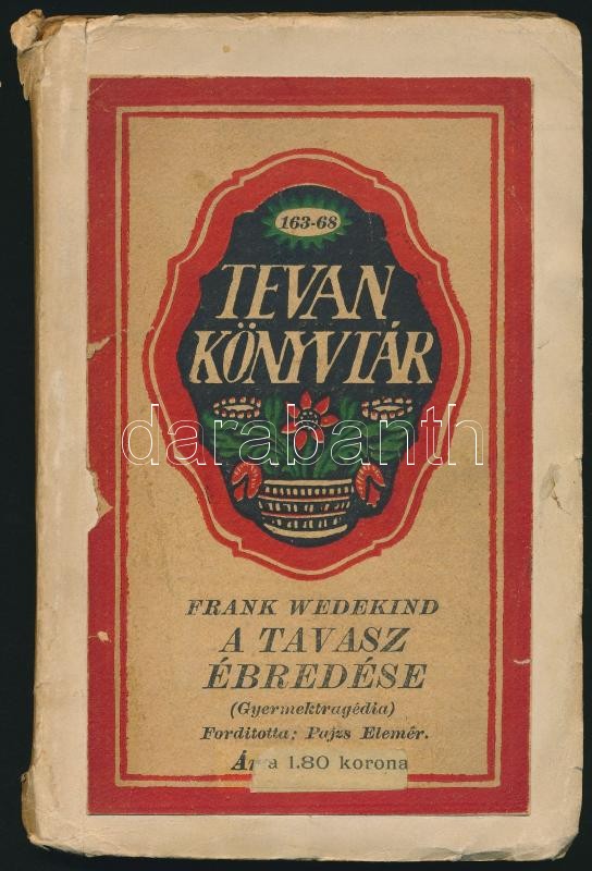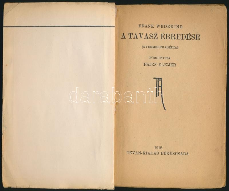 Frank Wedekind: A tavasz ébredése. (Gyermektragédia) Tevan Könyvtár 163-68. Fordította: Pajzs Elemér. Békéscsaba, 1918, Tevan kiadás. Átkötött papírkötés, az eredeti borítót az átkötéskor felhasználták, kissé sérült gerinccel, kissé szakadt borítóval.