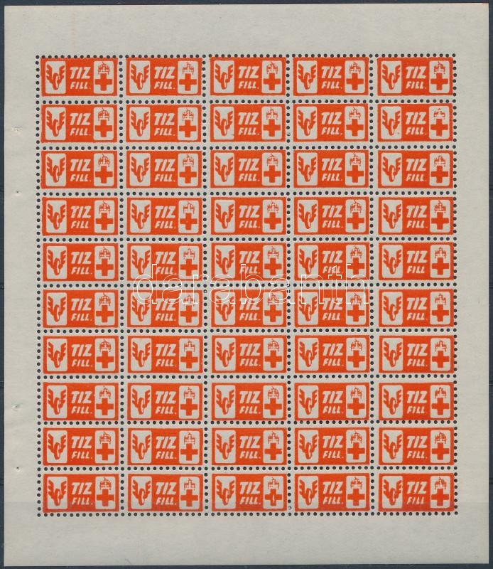 ca. 1944 Adománygyűjtő 10f bélyeg Vöröskereszt javára, 50-es kisív https://www.darabanth.com/hu/335-Gyorsarveres/335.0/Magyar-filatelia-es-postatortenet/Parafilatelia~500015/ca-1944-Adomanygyujto-10f-belyeg-Voroskereszt-javara-50-es-kisiv~II1881455