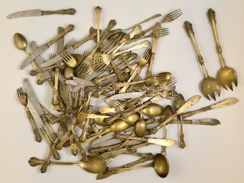 Leírás: 83 darab jelzett alpakka evőeszköz. Hiányos készlet, de a legtöbből megvan legalább 6 db