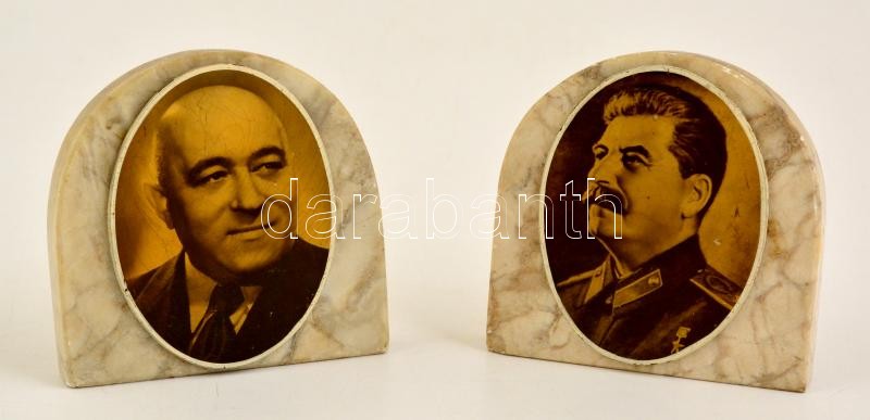 Leírás: Alabástrom fényképtartó Sztálin és Rákosi képével, kopott, 10×10 cm (2×)