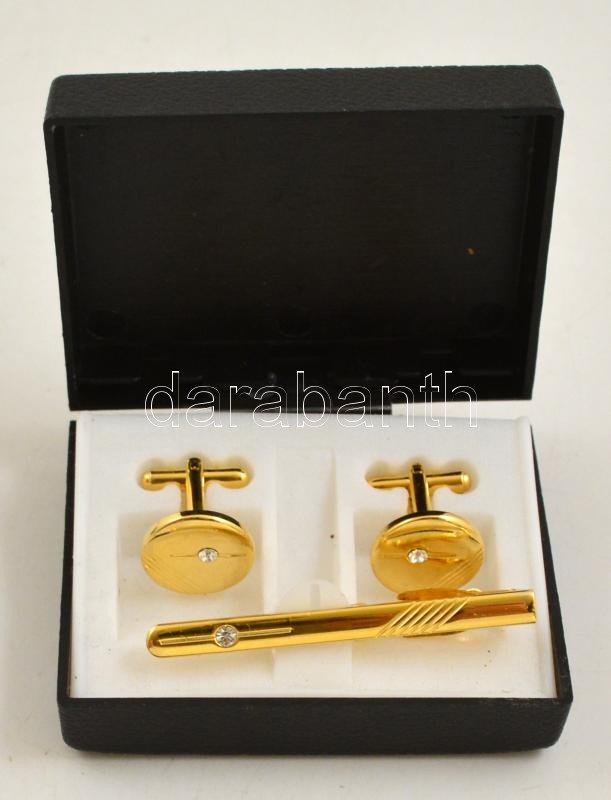 Leírás: Aranyszínű mandzsettagomb párban, nyakkendőtűvel, jó állapotban, dobozban