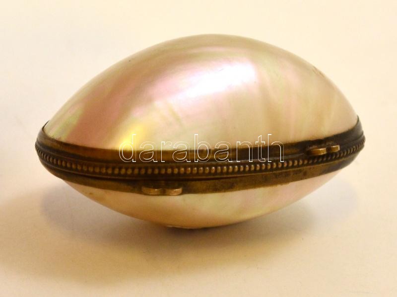 Leírás: Gyöngyház kagyló formájú dobozka, réz szerelékkel, belül 1903-as feliratokkal, h:6 cm