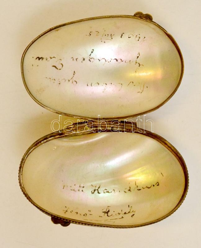 Gyöngyház kagyló formájú dobozka, réz szerelékkel, belül 1903-as felir... https://www.darabanth.com/hu/335-Gyorsarveres/335.0/Mutargy-papirregiseg-egyeb/Bolhapiac~500011/Gyongyhaz-kagylo-formaju-dobozka-rez-szerelekkel-belul-1903-as-feliratokkal-h6-cm~II1878276