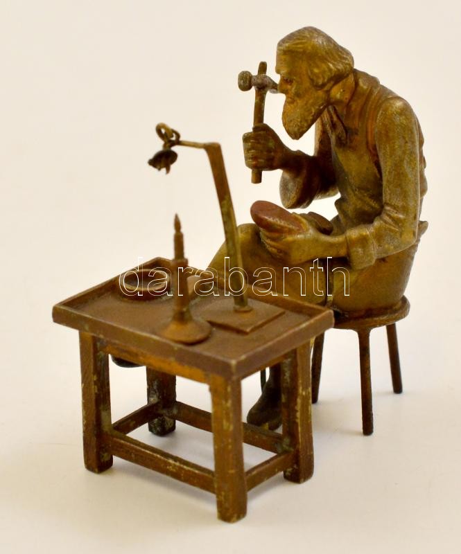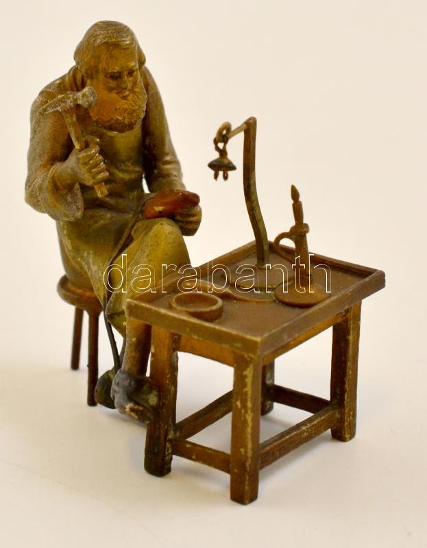 Leírás: Réz cipész figura, aprólékos kidolgozással, jelzés nélkül, m:5,5 cm