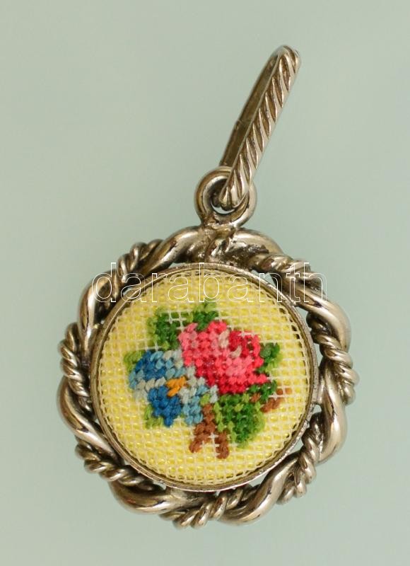 Leírás: Rózsás gobelin medál fém keretben, d: 1,05 cm