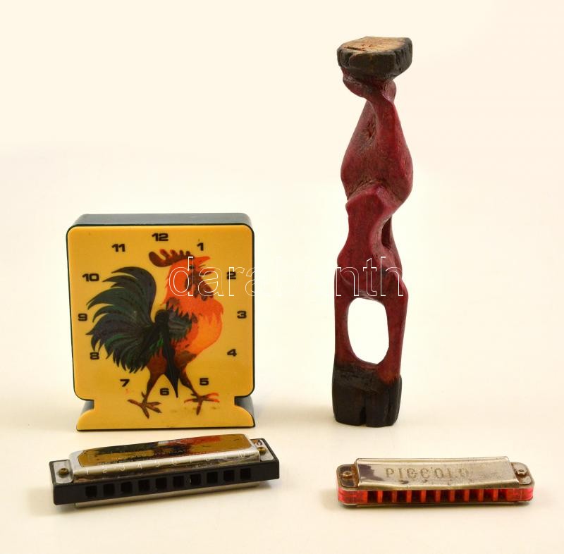 Leírás: Vegyes bolha tétel, összesen 4 db: szájharmonika, fa szobrocska, óra alakú persely
