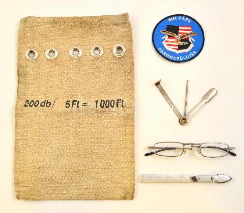 Leírás: Vegyes bolha tétel, összesen 5 db: katonai repülős felvarró, pénzeszsák, összecsukható szemüveg, szerszámok