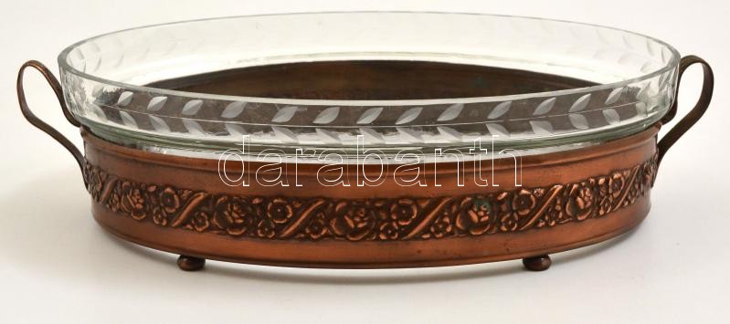 Leírás: Vörösréz asztali kínálótál, üveg betéttel, rajta minimális hibával, 32×19×8 cm