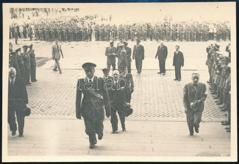 Leírás: 1947 Dinnyés Lajos miniszterelnök katonai kísérettel, Úrnapi körmenetben a Bazilikánál Alberty Antal fotója 13x8 cm