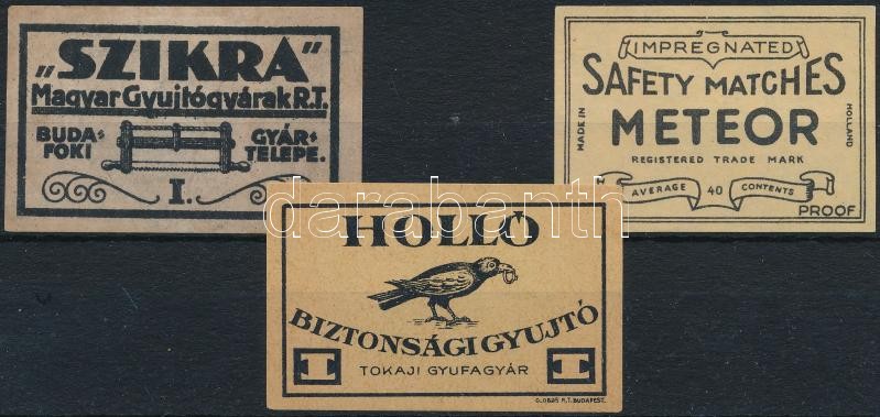 Leírás: 3 db régi gyufacímke (Szikra, Meteor, Holló)