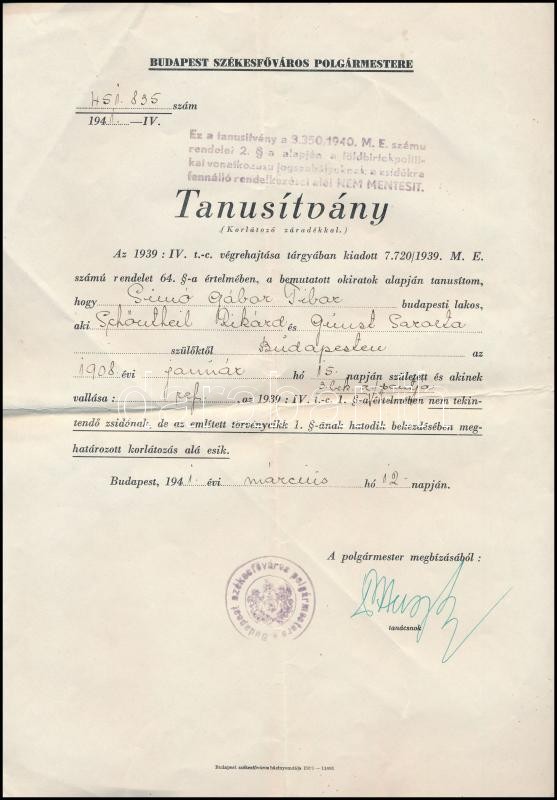 1941 Bp., Budapest Székesfőváros polgármestere által kiállított tanúsí... https://www.darabanth.com/hu/335-Gyorsarveres/335.0/Mutargy-papirregiseg-egyeb/Judaika~500028/1941-Bp-Budapest-Szekesfovaros-polgarmestere-altal-kiallitott-tanusitvany-korlatozo-zC3~II1882584