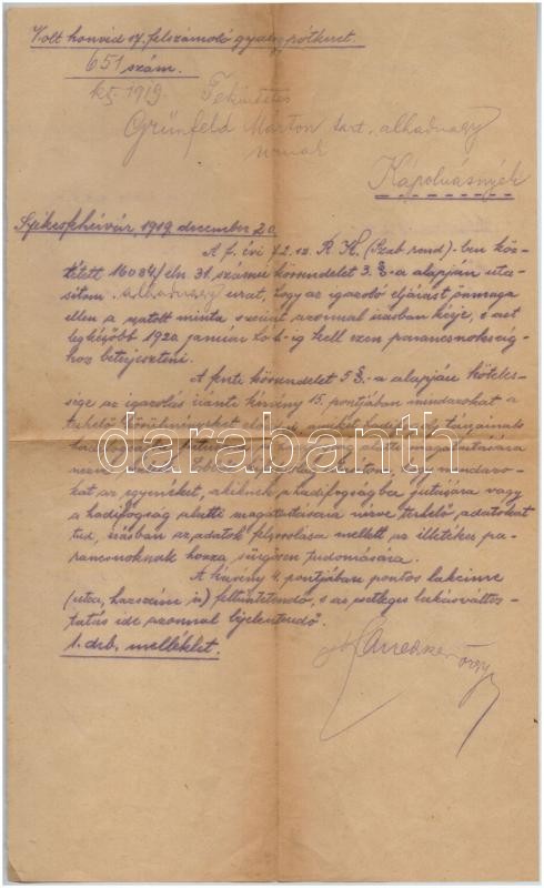 Leírás: 1919 Székesfehérvár, volt honvéd 17. felszámoló gyalogos pótkeretek levele tartalékos alhadnagy részére, melyben kérik az igazoló eljárás lefolytatására felszólító levél, 1919. dec. 20., borítékkal
