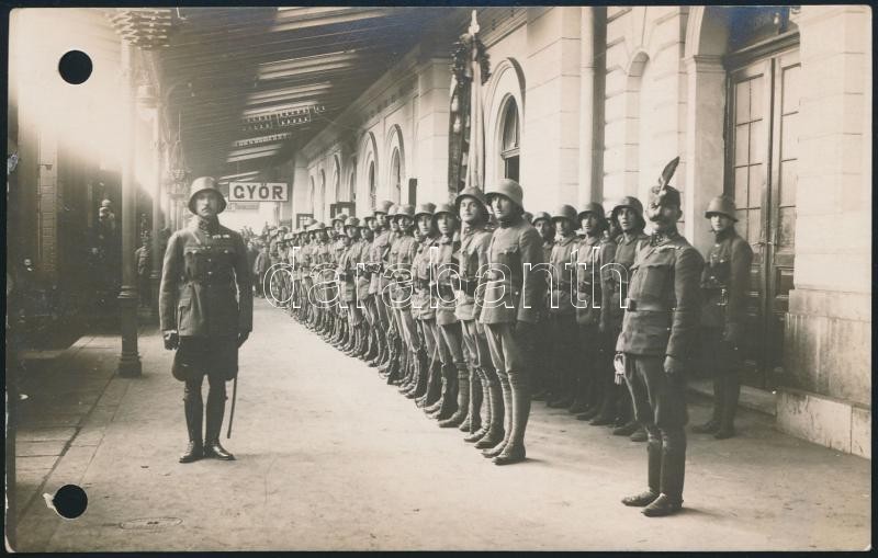 Leírás: 1921 szept. 20. Győr, vasútállomás, IV. Károly visszatérési kísérlete, királypuccs, a díszszázad sorfala, Schäffer Ármin udvari fényképész, 8,5x14 cm