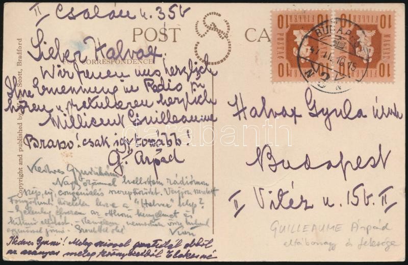 Leírás: 1942 Guilleaume Árpád altábornagy és felesége által írt és aláírt képeslap