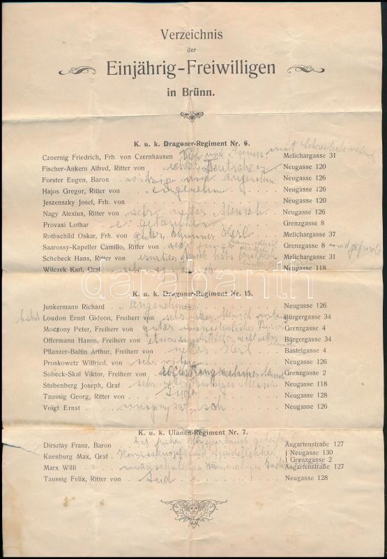 cca 1890-1910 Brünni katonaiskola első éves hallgatóinak névsora, rajt... https://www.darabanth.com/hu/335-Gyorsarveres/335.0/Mutargy-papirregiseg-egyeb/Militaria~500031/cca-1890-1910-Brunni-katonaiskola-elso-eves-hallgatoinak-nevsora-rajta-magyar-nevekkel-es-cer~II1881356
