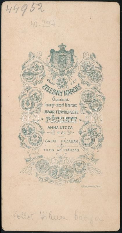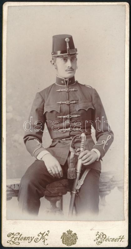 Leírás: cca 1900 nagymányai Koller család tagjának katonaportréja, nagymányai Koller Vilma (1879-1956) bátyja, keményhátú fotó, Pécs, Zelesny Károly, 16x8 cm
