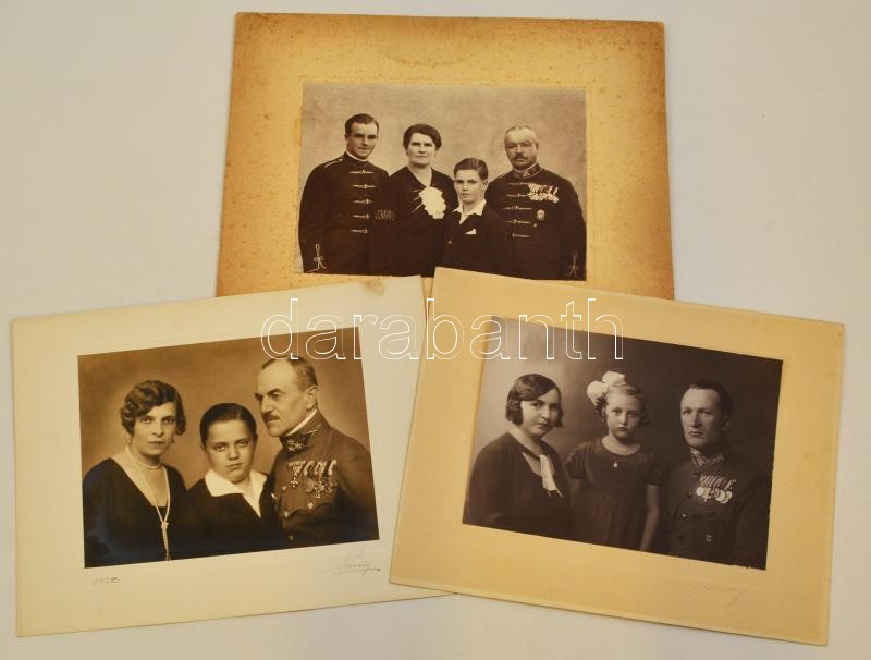 Leírás: cca 1930 Katonatisztek családi körben, sok kitüntetéssel, 3 db vintage műtermi fotó, 16x22 cm, karton 25x32 cm