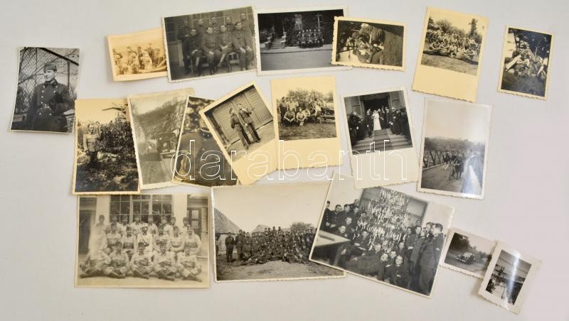 Leírás: cca 1938-1943 Vegyes katonafotók: csoportképek, életképek, stb., egy részük hátulján feliratozva, különböző méretben, összesen 19 db