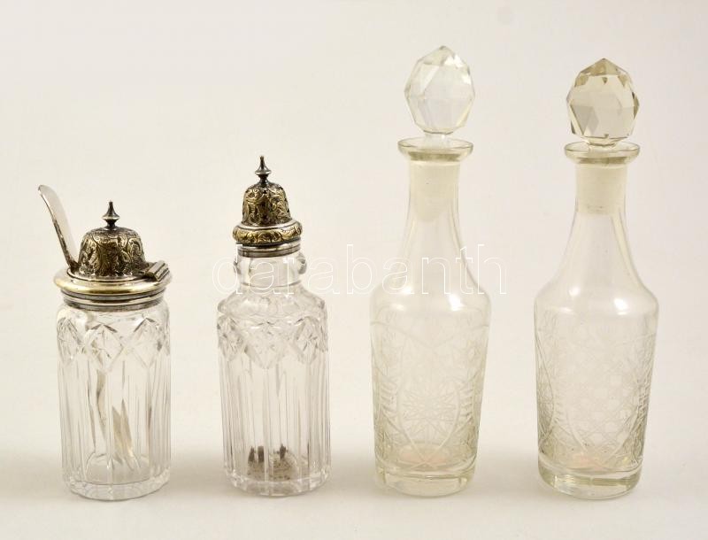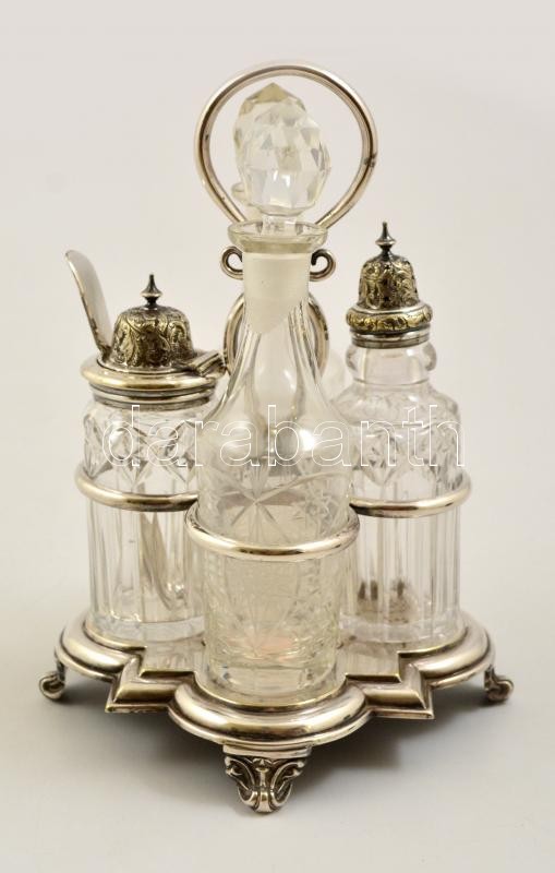 Leírás: Ezüstözött alpakka olaj-ecet tartó (négyes, kanállal), jelzett (W&H), hibátlan, m: 22 cm