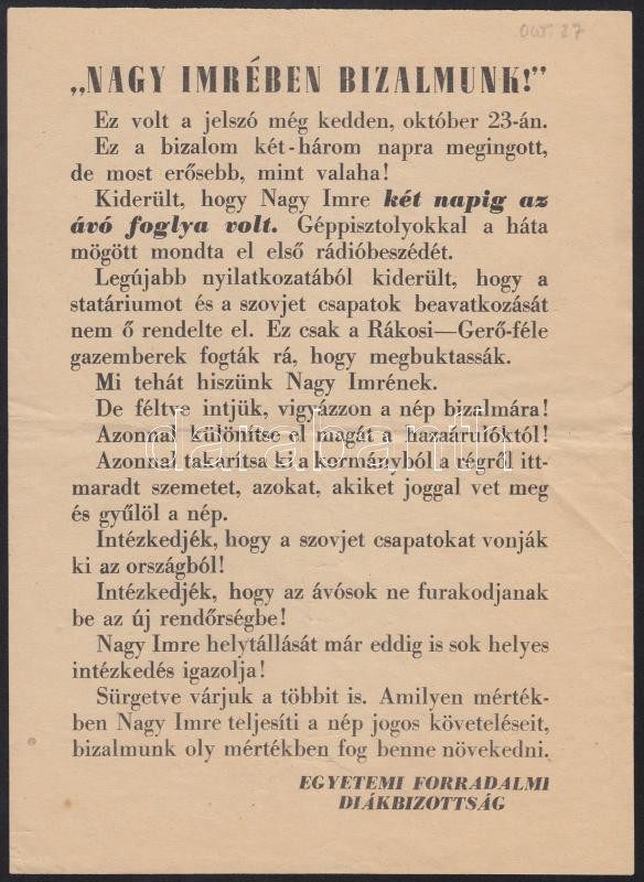 Leírás: 1956 "Nagy Imrében a bizalmunk!", Egyetemi Forradalmi Diákbizottság röplapja, 21x14 cm