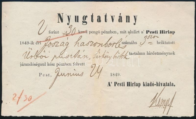 Leírás: 1849 A Pesti Hírlap hirdetési nyugtája
