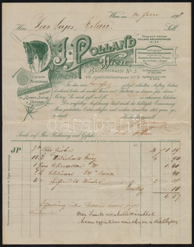 Leírás: 1898 Wien Polland lovas dolgok boltja díszes fejléces számla