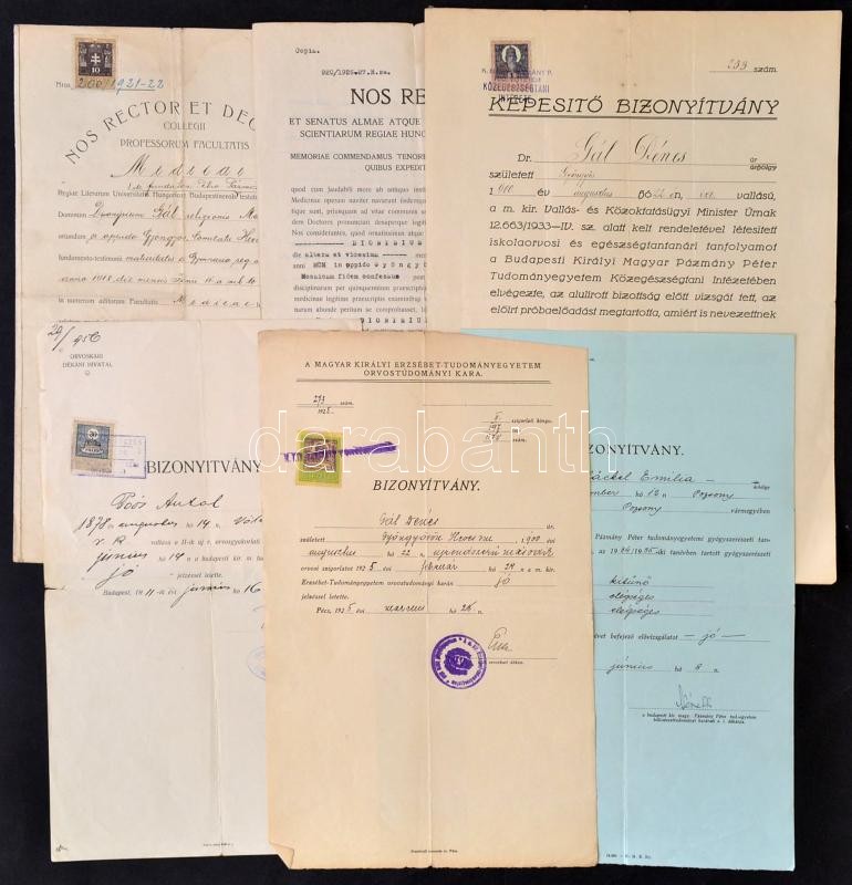 Leírás: 1911-1935 Orvosi bizonyítványok, okmánybélyegekkel, 6 db