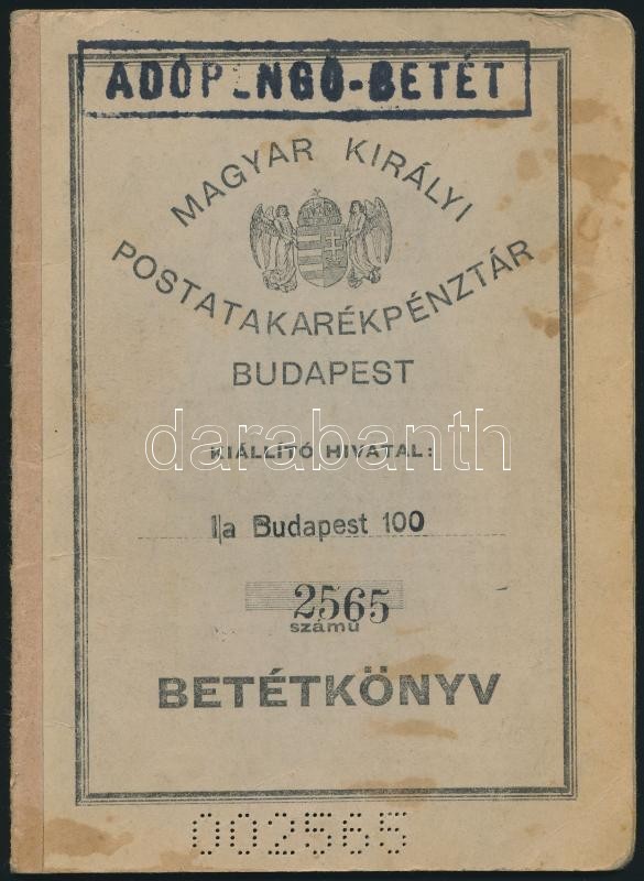 1946 Bp., M. Kir. Postatakarékpénztár betétkönyve, adópengő-betét bély... https://www.darabanth.com/hu/335-Gyorsarveres/335.0/Mutargy-papirregiseg-egyeb/Okmanyok~500017/1946-Bp-M-Kir-Postatakarekpenztar-betetkonyve-adopengo-betet-belyegzessel-a-boriton~II1878230