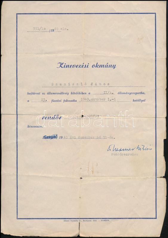 1949 Rendőr szakaszevezetői kinevezés BM II/a https://www.darabanth.com/hu/335-Gyorsarveres/335.0/Mutargy-papirregiseg-egyeb/Okmanyok~500017/1949-Rendor-szakaszevezetoi-kinevezes-BM-IIa~II1882127