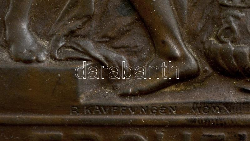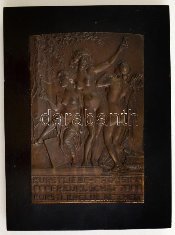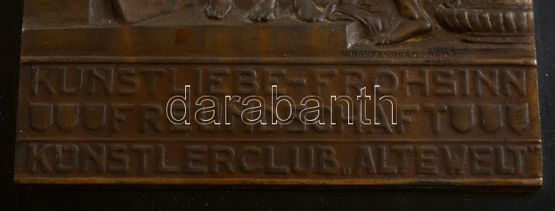 1910 Richard Kauffungen (1854-1942): Kunstlerliebe-Frohsinn Freundschaft Künstlerclub "Alte Welt" szecessziós, erotikus bronz plasztika fa alapon. Jelzett. R. Kauffungen MCMX. Plakett mérete: 12x18 cm / Art nouveau bronze plaquette on wood. Signed,