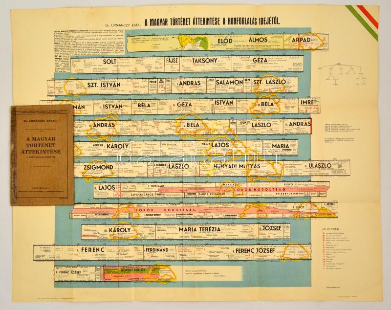 Leírás: 1941 Dr. Urmánczy Antal: A magyar történet áttekintése a honfoglalás korától. Nagymélretű, kihajtható grafikus térkép. 80x65 cm Ragasztott gerinccel