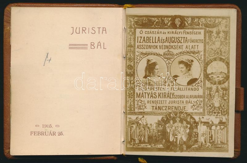 1905 Jurista bál táncrendje. A Budapesten felállítandó Mátyás király szobor alap javára rendezett Jurista bál táncrendje, 1905. február 25. Ő császári és király fenségeik Izabella és Auguszta főhercegasszonyok védnöksége alatt. Benne a nevek egyszerű felsorolása helyett a bálon szereplő hölgyek fotóival, alatta nevekkel, díszes, címeres lapszéli keretben. Készült Brust Béla Műintézetében, Bp. Aranyozott egészbőr-kötésben, rajta a Hunyadi címerrel, kissé kopott borítóval, a gerincen, és az elülső borító belsején kis sérüléssel, hiányzó ceruzával. 1905-ben a kolozsvári Mátyás-szobor mintájára Budapesten is egy hasonló emlékművet terveztek. Ennek céljaira alapot hoztak létre, amely bált szervezett. Az emlékmű végül nem valósult meg. A résztvevők részére különleges táncrendekkel kedveskedtek.