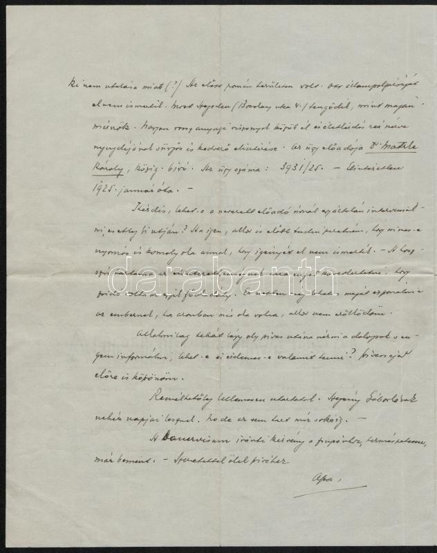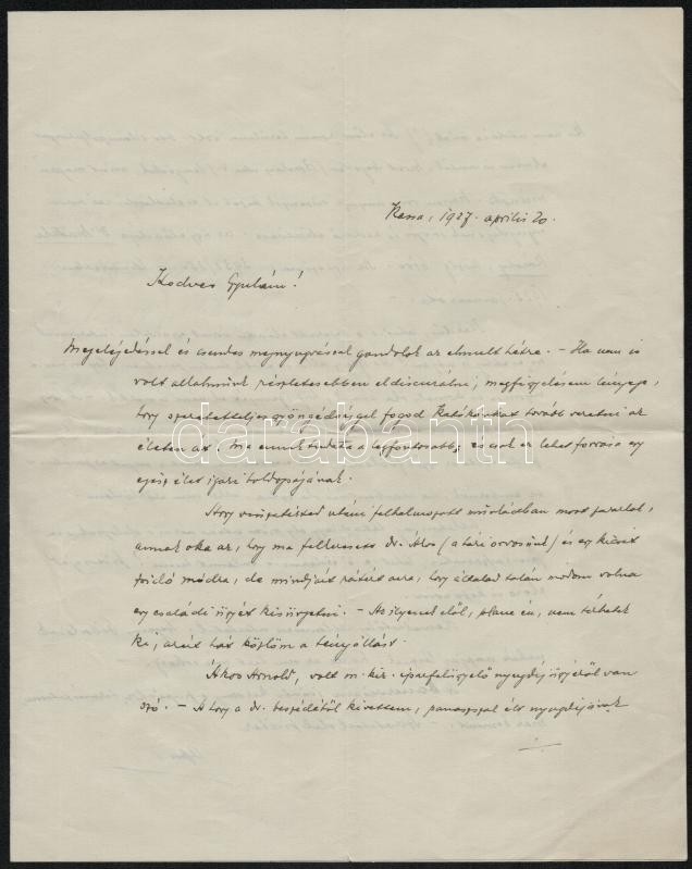 1927 Kassa, Dr. Grosschmid Géza (1872-1934) a kassai jogászkamara elnöke, csehszlovák szenátor, királyi közjegyző, és Márai Sándor apjának saját kezű levele Dr. Jáky/Jetts Gyula, lánya Grosschmid Kató férjének, Márai Sándor sógora részére, "Kedves Gyulám!" megszólítással, "Apa" aláírással, hivatali ügyekben, kettő gépelt oldal