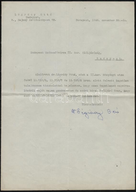1946 Légrády Ottó (1878-1948) újságíró és kiadó aláírása egy Budapest Székesfővárosa II. ker. Elöljáróságának, magánügyben küldött levélen, melyben kéri, hogy az említett ingatlanok megműveléséről ne gondoskodjanak, mert ezekről saját maga gondoskodik