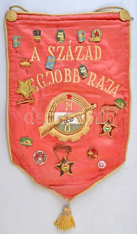 Leírás: ~1970. "A század legjobb raja" feliratú zászlón 16db jelvény és kitűző, a legtöbb militária témában T:2