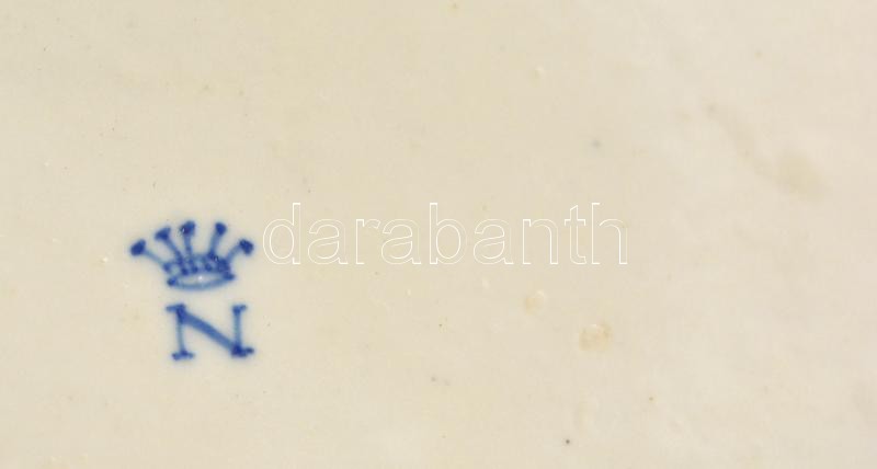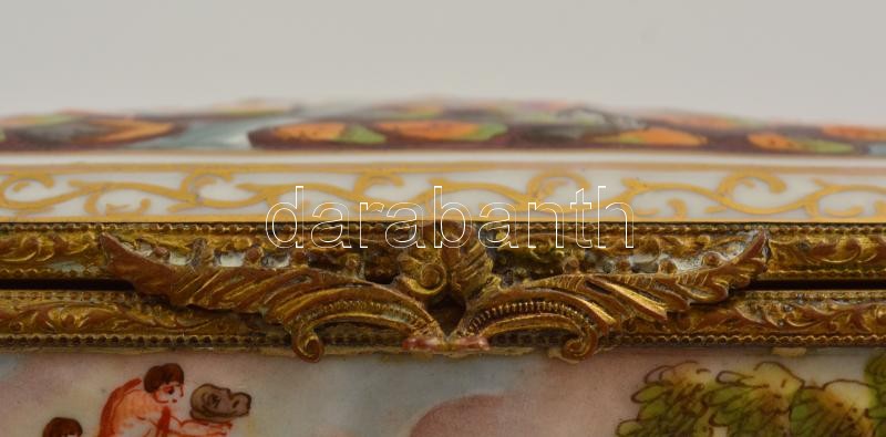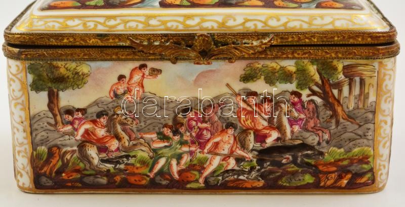 cca 1850 Capodimonte porcelán asztali díszdoboz, plasztikus mitológiai jelenetek, kézzel festett, belsejében virágos dekorral, jelzett, hibátlan, réz rátéttel, / Capodimonte porcelain box with mithological ornaments. Hand painted. 13,5×7,5 cm, m:6,5 cm