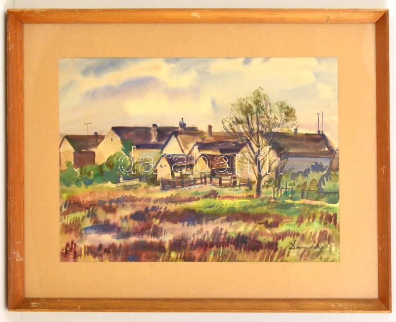 Leírás: Domanovszky jelzéssel: Falusi házak. Akvarell, papír, üvegezett keretben, 34×49 cm