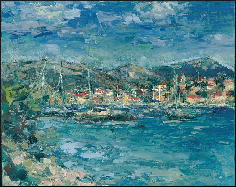 Leírás: Jelzés nélkül: Öböl. Olaj, farost, 20×25 cm