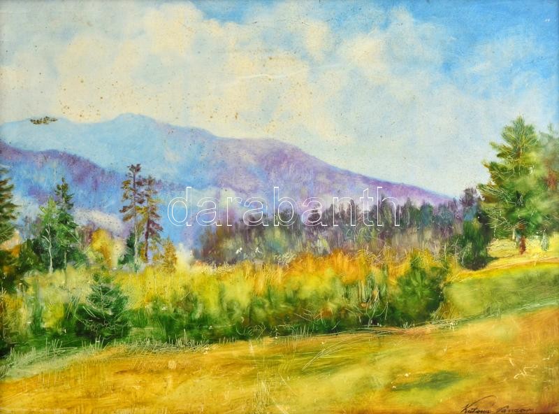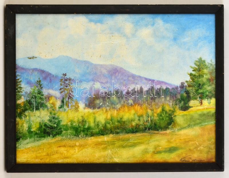 Leírás: Katona jelzéssel: Hegyvidéki táj. Olaj, karton, foltos-karcos, keretben, 43×58 cm