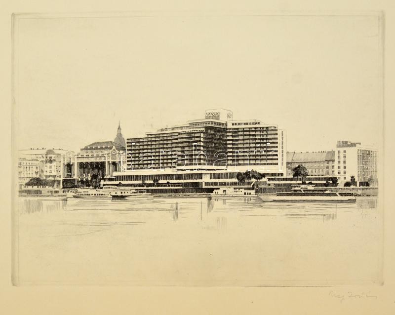 Leírás: Nagy Zoltán (1916-1987): Budapest, Duna Interkontinental. Rézkarc, papír, jelzett, 28×38 cm