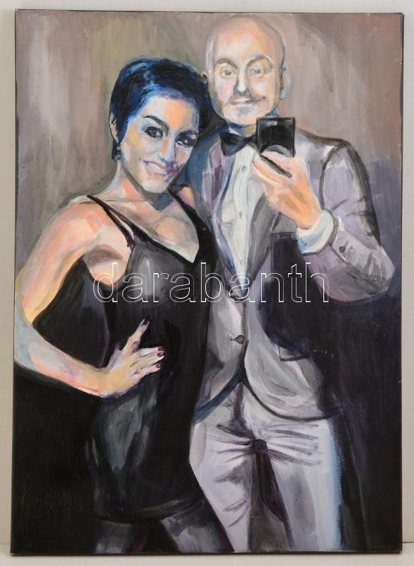 Leírás: Olvashatatlan jelzéssel: Mosoly a kamerának. Olaj, vászon, 70×50 cm
